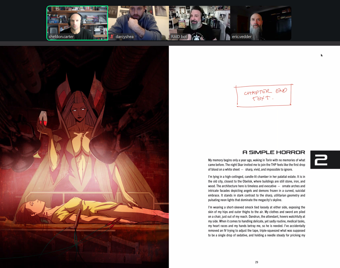 This is coming off our last meeting with Ramon and Darcy at Raid Press where we did a beta walk-through of the layout. It was a cool process where we went page by page through the book, marking up issues, adding art and text ideas, and then just ooohing and ahhhing over Eric’s art. Thought I’d give you a look behind the curtain: